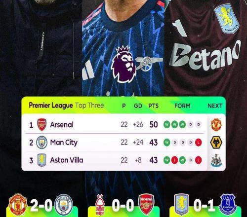 英超争冠变天!曼城维拉同时掉链子阿森纳有望8分领跑